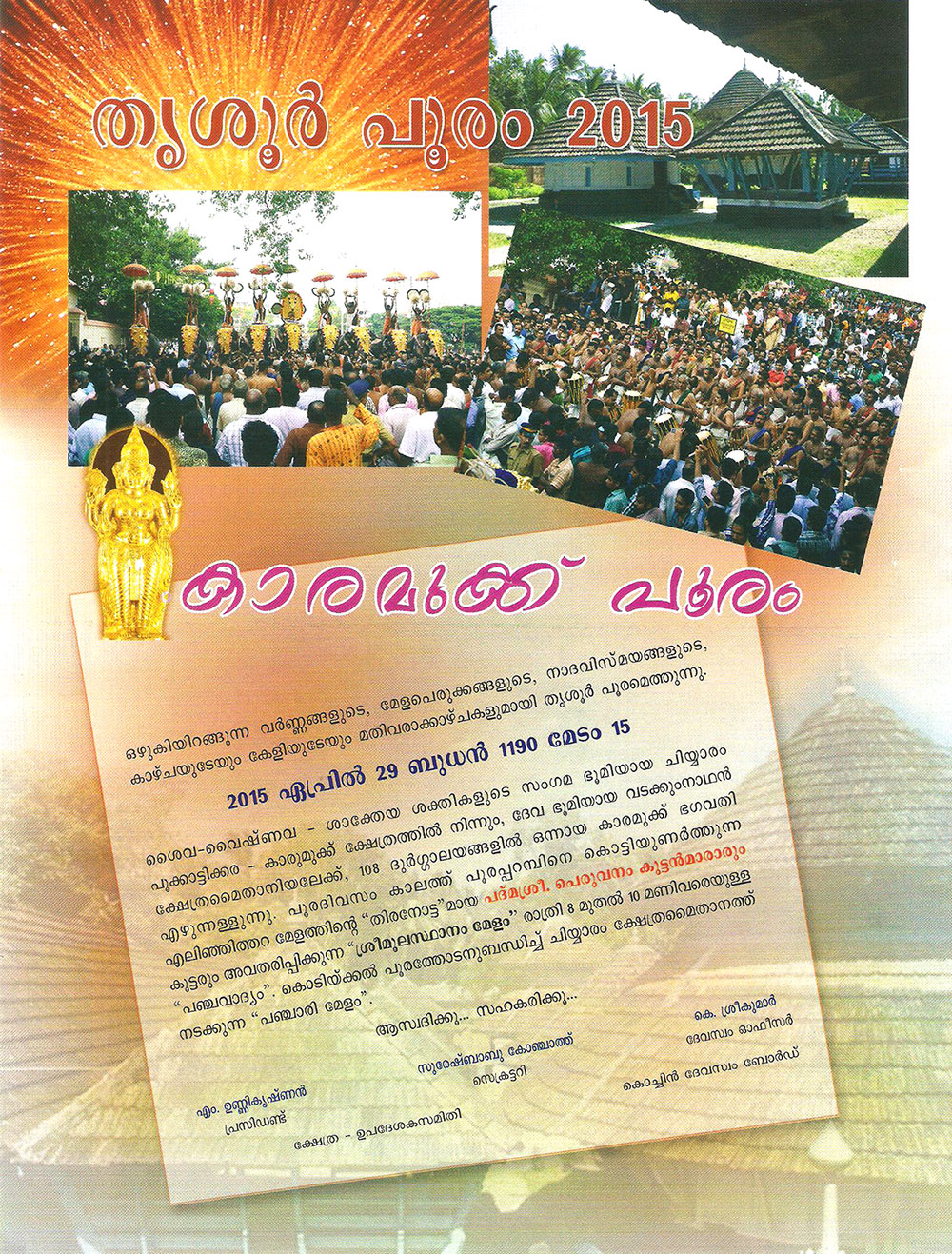 On the seventh day after Tantric Poojas. Karamukku Bhagavati's "Ezhunnallippu" starts Pooram muhurtham at 5am. Along with "Nadaswram" and Nadapandi, the Ezhunnallippu reaches Kulassery temple. The panchavadyam with more than 60 members and 3 elephants the possession reaches "Manikanatanal Pandal" at 8 O' clock. The Pandymelam with more than 100 artists and 9 elephants fully decorated begins. This is the curtain raiser of famous "Elinjitara Melam". The Pandimelam will be over by 9.30 a.m. at "Sreemoolastanam" and the deity go inside temple to pay respects to Lord Vadakkumanathan and exit to Southern gopuram.