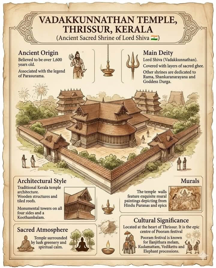 One of the 10 paradises in the world, Guruvayoor temple is located 29kms from Vadakumnathan.