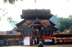 Simhodara Temple: Next to the eastern pathway connecting the east gopuram lies "Simhodara" temple. Simhodara is the trusted lieutenant of lord Siva and is guarding the main Siva temple, by watching the "thazikakudom" (There is a hole - triangle in shape - in the main wall, through which you can have the dharsan of the temple's "Thazhikakudam"). The real name of this deity is "Sarvaka" who was a student of wrestling to Nandikeswara (the holy bullock). During the trail the central part of the body of sarvaka was elongated and the name simhodara (belly of lion). Lord Siva agreed to be in Kerala as per the request of saint Parasurama and Sarvaka was deputed to find a suitable place. Sarvaka travelled all over and found all are suitable places. He was tired from the journey and was taking rest when Lord Siva came along with Devi. He kicked Sarvaka to the present place (kadikuzhi- the drainage).