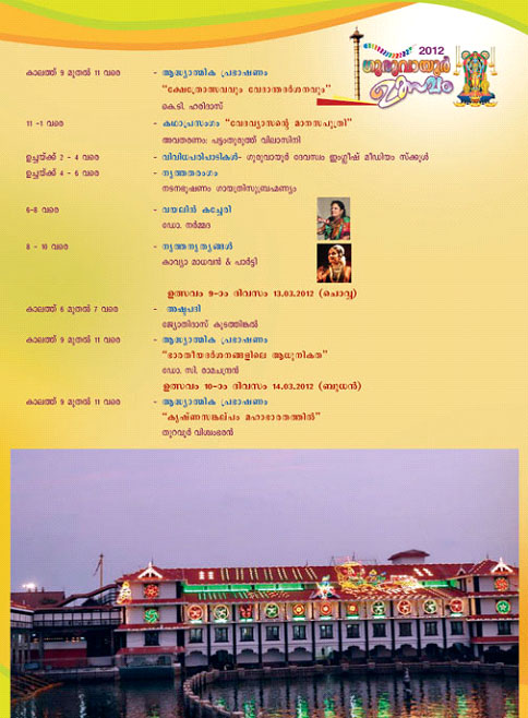 Lord "Mahavishnu" gave darsan to Vasudeva in the jail as "Bal Vishnu" and thus the concept of baby boy Unnikrishnan the legend. The concept was popularized by Poet "Poothanam" through his famous stanza "who need another kid when Unnikrishnan is with in my heart?". Another poet "Melpathoor" and ardent devotee "Kurooramma" made this temple famous. Punnathoor Kotta - the elephant park some 3 Kms away from the temple where more than 65 elephants of Lord Guruvayoorappan is kept in natural ambience. Vrindavan Estate at vengad about 55 km from Guruvayoor at Malappuram (Dist) around 550 cows is looked after by the devaswom Guruvayoor Ekadasi & Chembai Sangeethotsava.( Music Festival). The Ekadasi, falls during Nov / Dec. months, is the day Lord Sree Krishna imparted Sreemat Bhavad Geetha to Arjuna at the battle field of Kurushetra. The 15 day long music festival, which last till the ekadasi night is in commemoration of Chembai Vaidyanatha Bhagather who was a doyen of Karnatic music. Bagavather was an ardent devotee of lord Guruvayoorappan and used to offer his music recital on the Ekadasi day till he left his heavenly abode.